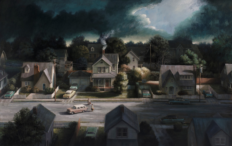 Spanish-born painter Alberto Ortega brings a sharp eye to the sprawling conformity of American suburban life. In a continuing series of panoramic scenes set in what appears to be some idyllic 1950s suburb, he uses the drama of deep twilight and a kind of disquieting simplification to create a sense of unease and foreboding. It’s as though an episode of “The Twilight Zone” was painted by Edward Hopper.